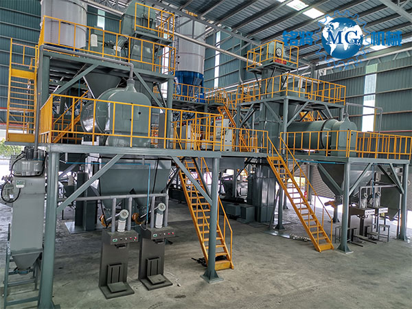 该套生产线在全自动干粉砂浆生产线的基础上,增配针对玻化微珠物理特性专门研制的离心式滚筒混合机及高效专用体积打包机(敞口包装机可选)。该套生产线效率高、产量大、适用性强、操作性好。该套设备实现多点除尘处理,工作环境好,有力保障员工身心健康,创造高效清洁的生产环境。
