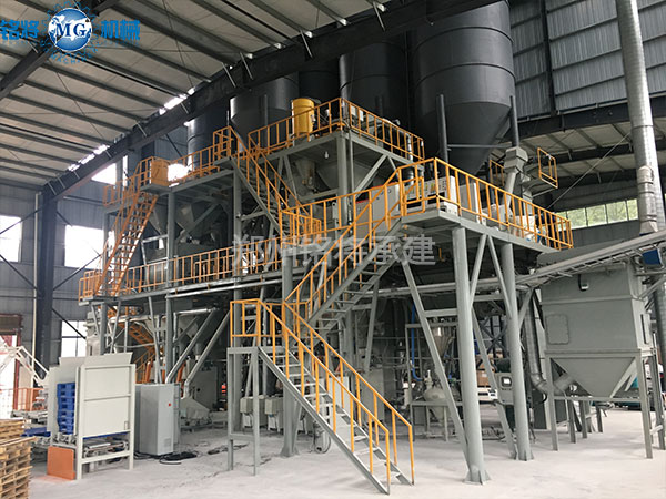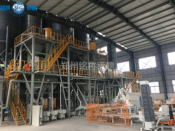 石膏砂浆生产线主要由储料系统、物料输送系统、自动配料系统、高效无重力混合系统、新型收尘系统、空气动力系统、自动包装系统、自动控制系统、优质钢架平台等构成。