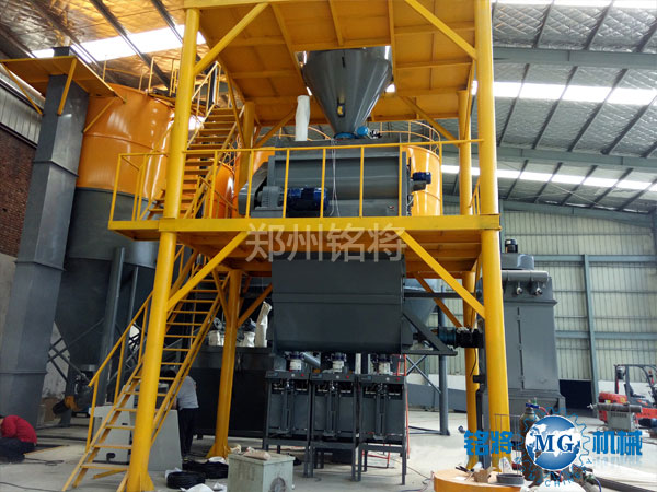 石膏砂浆生产线主要由储料系统、物料输送系统、自动配料系统、高效无重力混合系统、新型收尘系统、空气动力系统、自动包装系统、自动控制系统、优质钢架平台等构成。