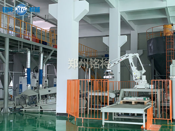 苏州鸿川建筑材料有限公司全自动干粉砂浆生产线、自动包装输送码垛生产线由郑州铭将承建。本套生产线与其它生产线不同的是采用了气体输送,另外增添了自动输送和码垛系统。